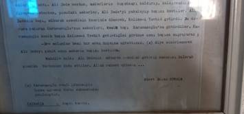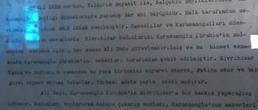 Sadeleştirilmiş yazıya girişte şu açıklamalar yazılmıştır: “Ali Dede merhum Yıldırım Beyazıt (d. 1354–ö. 1403) (Ali Dedenin ölümü II. Murat ( d. 1404- ö. 1451 ) döneminde olduğuna göre gençliği Çelebi Mehmet ( d.1386 – ö.1421) dönemine rast gelmektedir H.Ö.) ile Selçuklu Beyliklerinden Karamanoğlu Beyliği dönemlerinde yaşamış bir Ahi büyüğüdür. Halk tarafından sevilmiş kendisine “EMİN İNSAN” denilmiştir. Osmanlılar ve Karamanoğulları döneminde yapılan savaşlarda Sivrihisar kadınlarını Karamanoğlu II. İbrahim’in zulmünden korumak için her zaman Ali dede görevlendirilmiş ve hizmet esnasında Karamanoğlu İbrahim’in askerleri tarafından şehit edilmiştir. Sivrihisar kadın ve kızları o zamandan bu yana türbesini ziyaret ederek Fatiha okur ve bir giysi ziynet eşyası takarlar. Türbesi adeta çeyiz evini andırır”[5]. Ali Dede’nin katledilmesi Osmanlı Padişahı II. Murat ( 1404- 1451 ) Karamanoğlu II. İbrahim’in (1406 – 1464) dönemlerinde vuku bulmaktadır. “Hikâyet-i hurûc-ı Murat Han İlâ Karaman bi gaaretihi” başlıklı bölümünde Ali Dede olayı anlatılmaktadır.